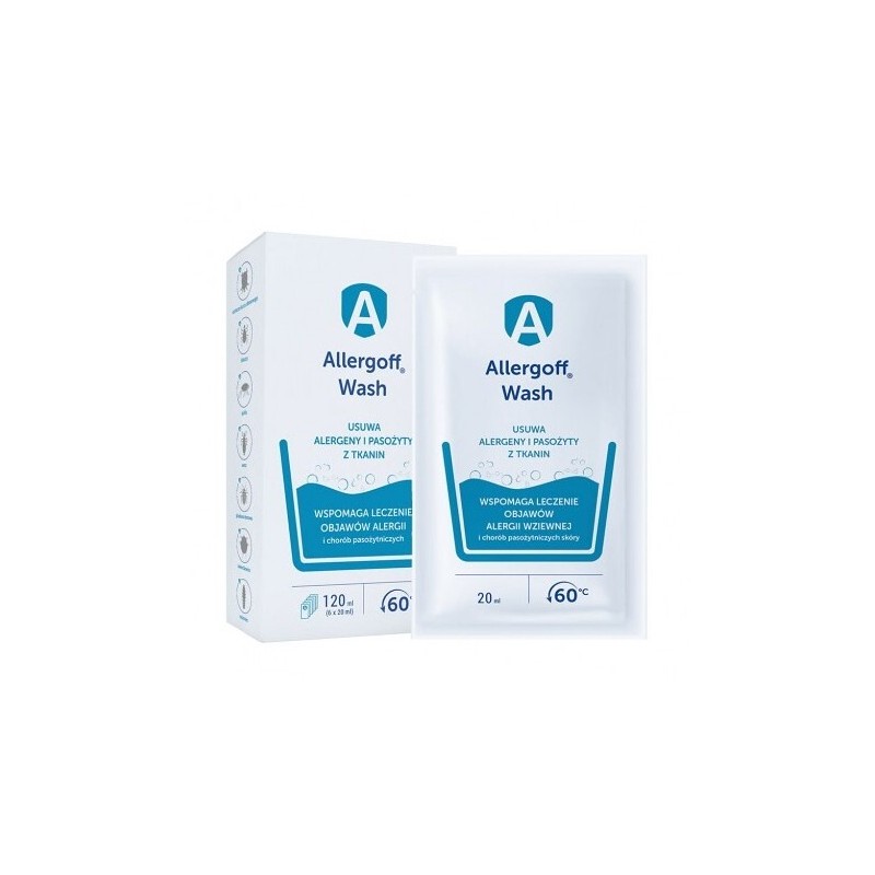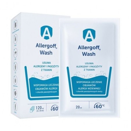 Allergoff® Wash dodatek do prania w niskich temperaturach usuwa alergeny (m.in. roztoczy kurzu domowego) oraz ułatwia fizyczną eliminację pasożytów obecnych w tkaninach (pchły, kleszcze, wszy, pluskwa domowa) w temperaturze poniżej 60°C. Wspomaga leczenie objawów alergii wziewnej oraz zakażenia świerzbowcem i nużeńcem. Zalecany jest również do prania legowisk dla zwierząt.