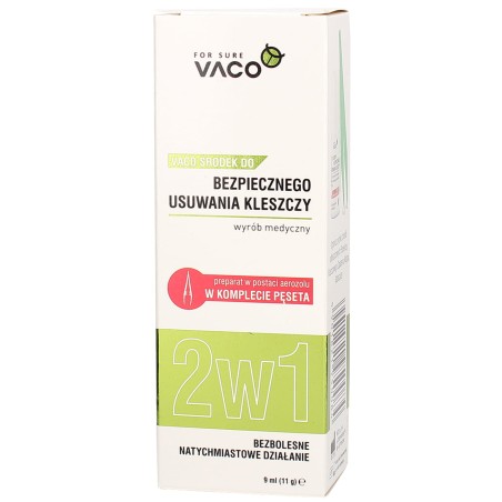 Wyrób medyczny VACO Środek do bezpiecznego usuwania kleszczy przeznaczony jest do usuwania z ciała człowieka kleszcza poprzez jego całkowite zamrożenie, co pozwala na zapobieganie pojawiania się u ludzi odkleszczowych chorób, wywoływanych przez ukąszenie kleszcza będącego nosicielem zarazków takich chorób jak m.in. Boreliozy, Kleszczowego Zapalenia Mózgu, Babeszjozy.