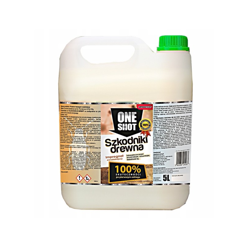 ONE SHOT na szkodniki drewna 5 litrów to skuteczny impregnat do drewna marki ONE SHOT, który zapewnia długotrwałą ochronę drewna przed różnymi szkodnikami. Preparat na szkodniki drewna zawiera permetrynę i 1,2-benzoizotiazolo-3(2H)-on, które działają biobójczo na owady żerujące w drewnie, takie jak: