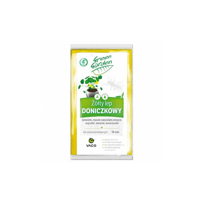 VACO GREEN GARDEN Żółty lep doniczkowy. Kleiste arkusze doniczkowe przeznaczone są do monitorowania obecności szkodników, takich jak ziemiórki, muszki owocówki, mszyce, śmietki, mączliki i inne, poprzez ich odławianie.