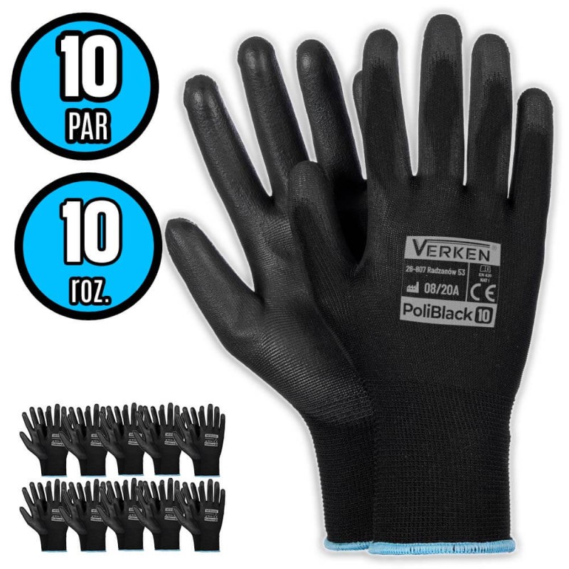 ➡️ Marka: VERKEN ➡️ Typ: rękawice ➡️ Rozmiar: 7 ➡️ Składniki główne: poliester, poliuretan ➡️ Ilość: 10 par