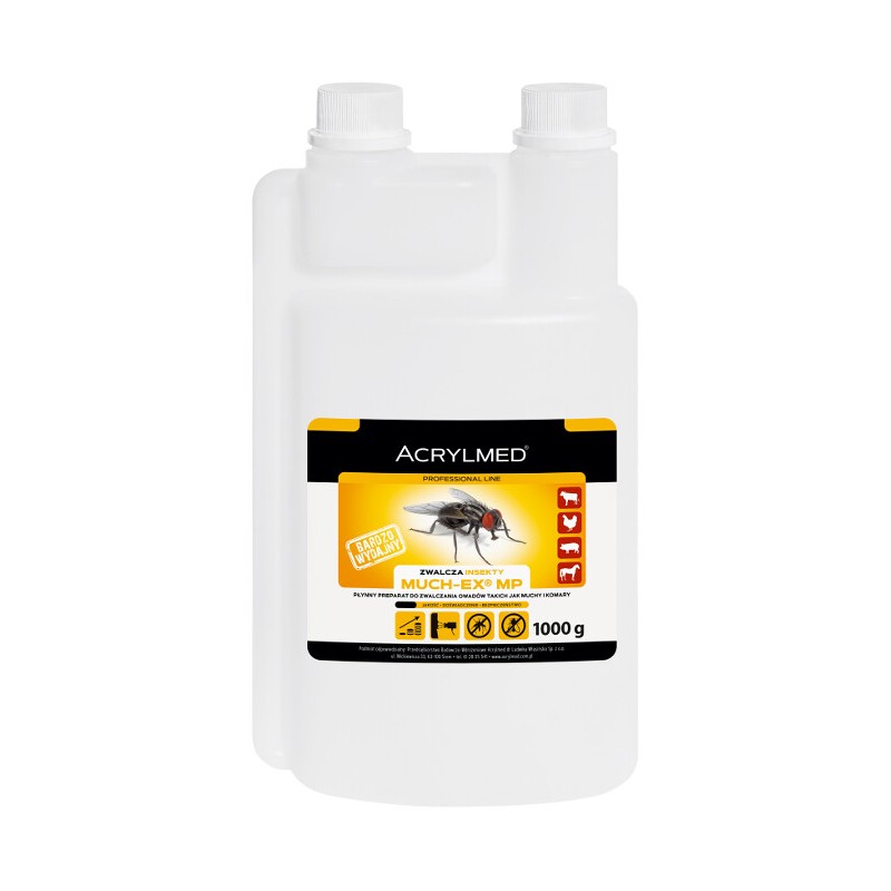 Much-ex MP ACRYLMED 1000ml to niezawodny gotowy preparat na muchy, który skutecznie zabezpiecza Twoje gospodarstwo przed inwazją owadów. Dzięki zawartości tetrametryny, permetryny i transflutryny, produkt gwarantuje długotrwałą ochronę i komfort Twoim zwierzętom hodowlanym