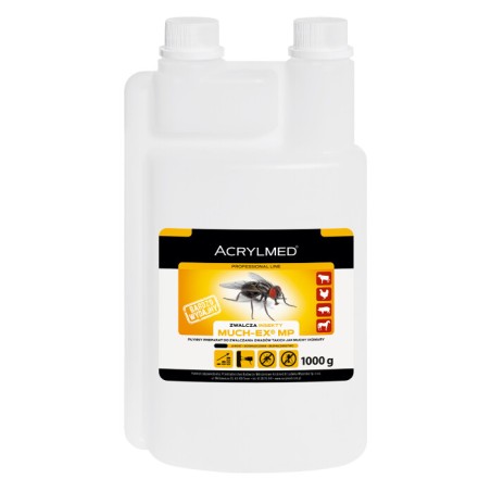 Much-ex MP ACRYLMED 1000ml to uniwersalny oprysk na muchy, który można stosować w różnych pomieszczeniach gospodarczych. Produkt jest bezpieczny dla zwierząt, z wyjątkiem tych uczulonych na permetrynę. Środek owadobójczy skutecznie zwalcza wiele rodzajów much oraz innych owadów, zapewniając higienę i czystość w oborach, stajniach, chlewach i stodołach.