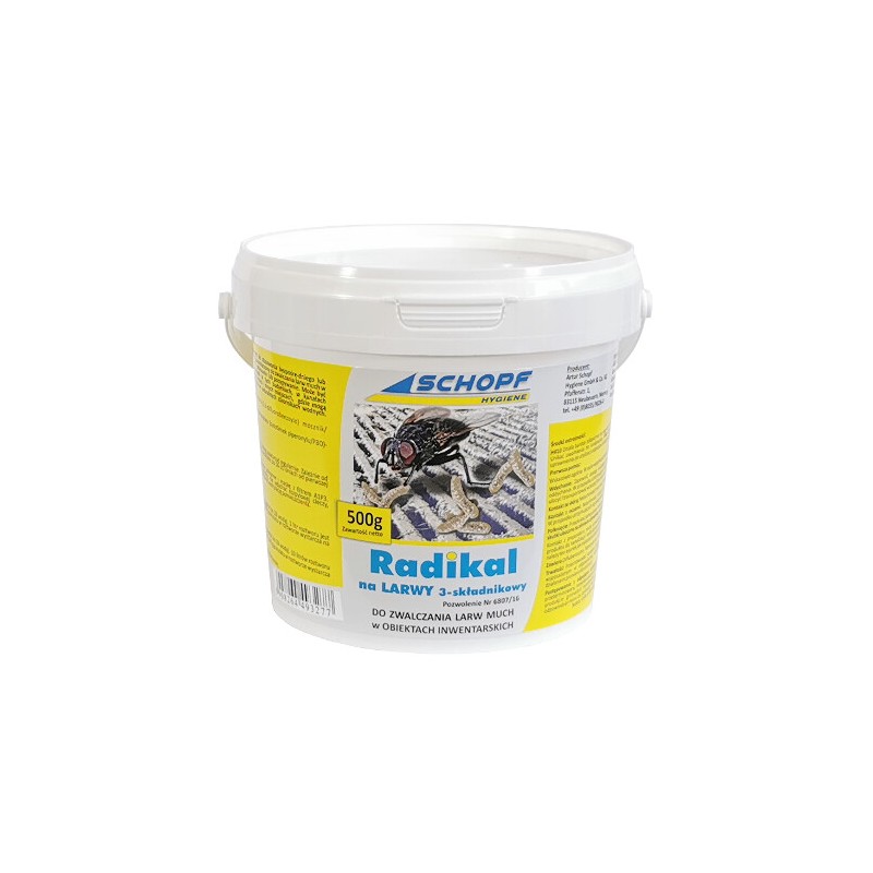 Radikal na larwy 3-składnikowy to preparat zwalczający oraz hamujący rozwój larwy much w obiektach inwentarskich. Może być stosowany bezpośrednio na powierzchnię w tych budynkach, w kanałach gnojowicowych, miejscach gromadzenia śmieci i wszędzie tam gdzie mogą rozwijać się larwy. Dzięki zawartości 2 nowych substancji aktywnych produkt powoduje równieź osłabienie żywotności form dorosłych. Preparatem można opryskiwać, polewać lub posypywać zainfekowane miejsca. Nie wolno stosować w produktu w naturalnych zbiornikach wodnych.