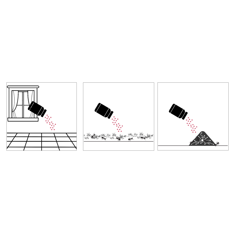 Wysyp widoczną warstwę granulatu bezpośrednio na gniazdo oraz wzdłuż tras, którymi poruszają się mrówki. To tam preparat zadziała najskuteczniej – w miejscach ich największej aktywności. Zalecana dawka: 10 g proszku na każdy 1 m² powierzchni zasiedlonej przez mrówki lub bezpośrednio na jedno gniazdo. W razie deszczu lub wilgoci – zaleca się ponowne rozsypanie świeżej porcji preparatu. Przy dużym nasileniu owadów – warto powtórzyć zabieg po kilku dniach.